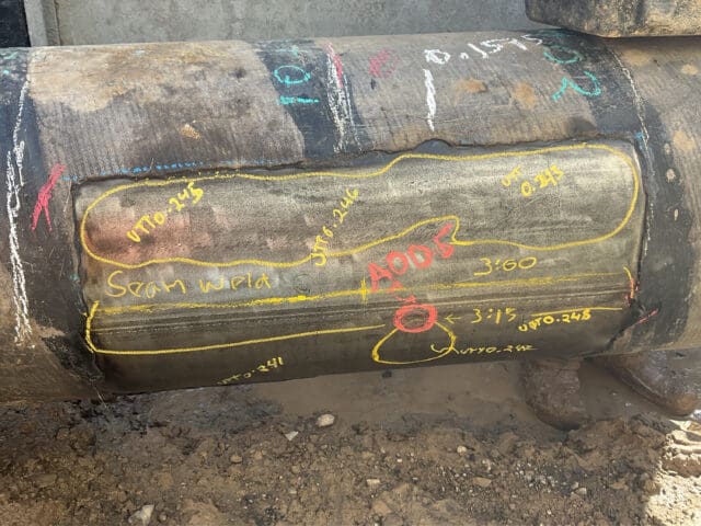 Pipe roundness measurements were performed to identify mechanical strain or denting, and results were compared against ILI-reported deformation data. All inspection findings were documented using GPS-enabled field data collectors and integrated into the utility’s assessment management system for traceability and future reference.