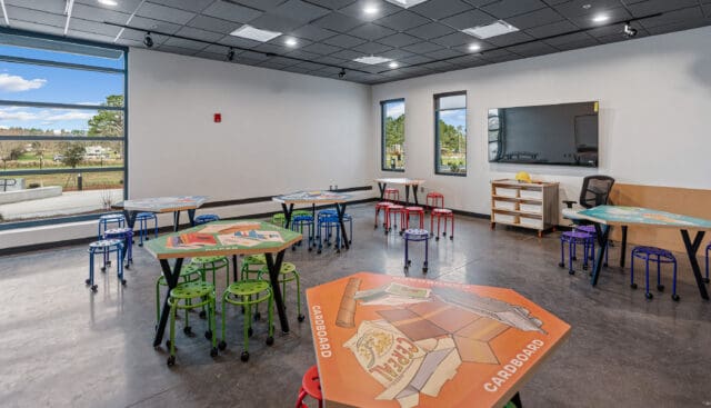 In addition to operational functionality, the facility includes a prominent community-facing component. The Waste & Recycling Adventure Center, designed by Whirl Wind Creative, is a two-story, 7,000 sq. ft. hands-on educational experience comprised of 20 interactive stations. It includes a mezzanine-level overlook where visitors can view the recycling process in action—from single-stream materials arriving on the tipping floor to their movement through separator screens, optical and metal sorters, and eventual baling for transport to manufacturers.