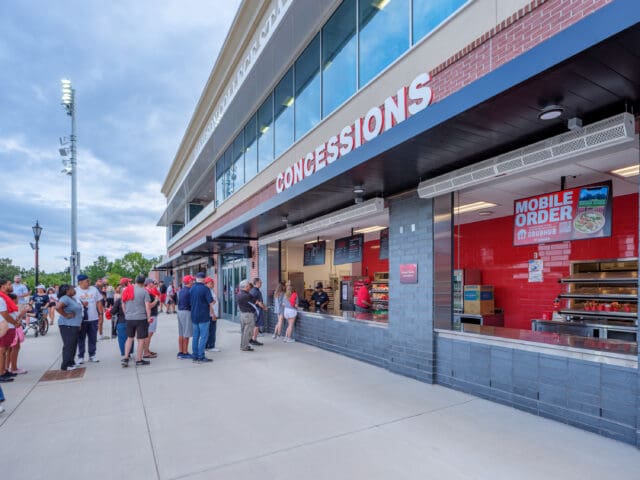 The 5,000-seat venue combines concrete tiered stands with informal grass berms, offering a variety of fan experiences. A continuous, horseshoe-shaped concourse wraps around the stadium, with concessions and amenities distributed along the route. At the south end zone, a state-of-the-art video scoreboard delivers live replays and dynamic graphics to heighten game-day excitement.