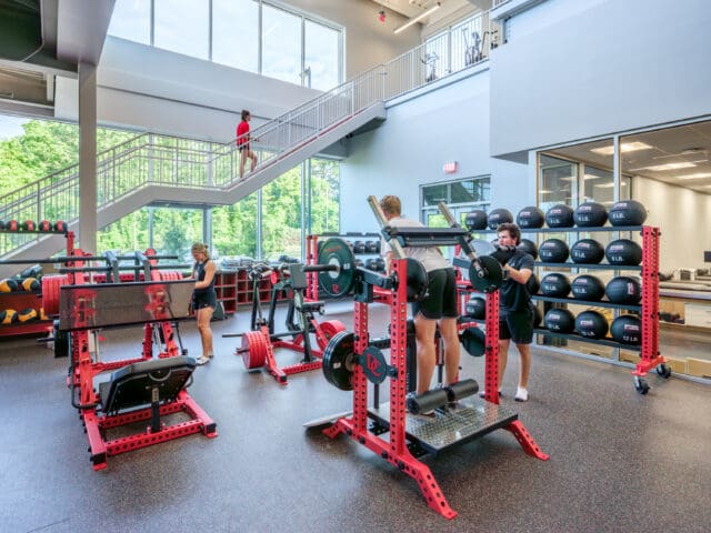High ceilings and large glass windows flood the weight room with daylight—a dramatic improvement over the college’s former subterranean gym—and reflect Davidson’s holistic approach to student-athlete wellness. A fueling station along the main circulation route into the weight room provides easy access to healthy grab-and-go nutrition between workouts, recovery sessions, and classes.