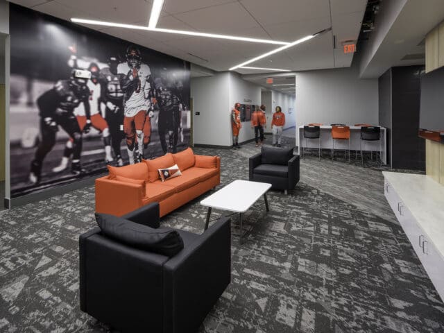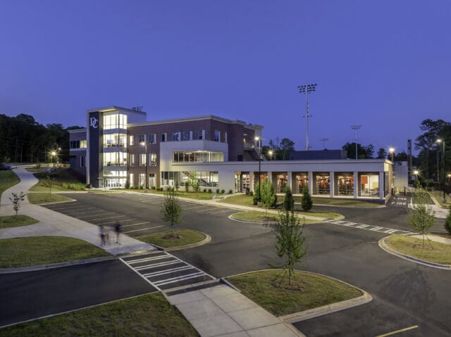 Situated along the west concourse, the three-story, 54,000-square-foot Game Changers Field House establishes a centralized home base for Davidson’s student-athletes. The facility’s brick and stucco façade blends contemporary and traditional design, while a branded entry tower anchors the complex. The tower features vertical glass panels that fill the interior with natural light and expansive campus views.