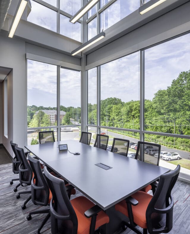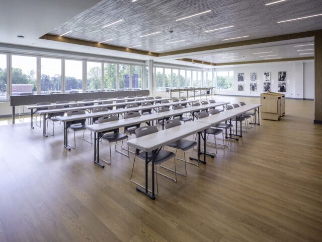 The third floor houses a student lounge, press box, and coaches’ office suite, which includes a two-story conference room that doubles as a dramatic recruitment space for prospective student-athletes. Anchoring the level, Gallery 18 is a multipurpose space that can function as two 50-person classrooms, host a full-team film study session, or be transformed into a hospitality suite. On game day, the exterior glazing opens to connect spectators visually and audibly to the field. Throughout Gallery 18, displays honoring Davidson alumni who have made meaningful contributions in public service, industry, and other fields celebrate a diversity of life paths and foster cross-generational connection, enhancing the space’s educational and inspirational impact.