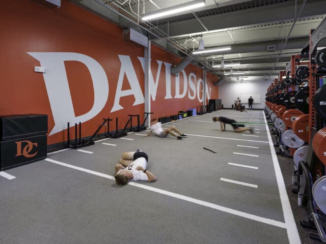 The first floor features home team locker rooms, football staff offices, and expanded and enhanced sports performance and sports medicine facilities. The sports performance facility was designed collaboratively with Davidson’s athletics staff, featuring a layout based on a circuit strength and conditioning model. The space includes traditional rack modules—versatile strength training stations equipped with weights and bars for exercises such as squats and presses. It also has an indoor artificial turf area for lateral and speed drills, which help athletes improve agility, quick directional movements, and sprinting performance.