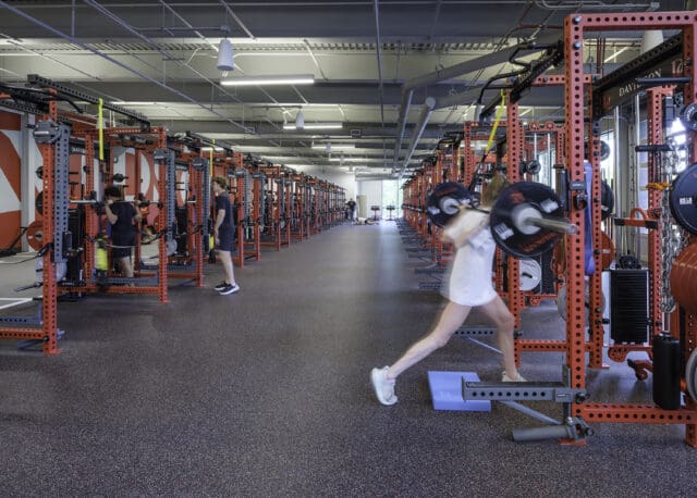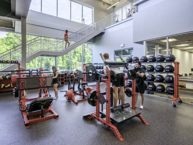 High ceilings and large glass windows flood the weight room with daylight—a dramatic improvement over the college’s former subterranean gym—and reflect Davidson’s holistic approach to student-athlete wellness. A fueling station along the main circulation route into the weight room provides easy access to healthy grab-and-go nutrition between workouts, recovery sessions, and classes.