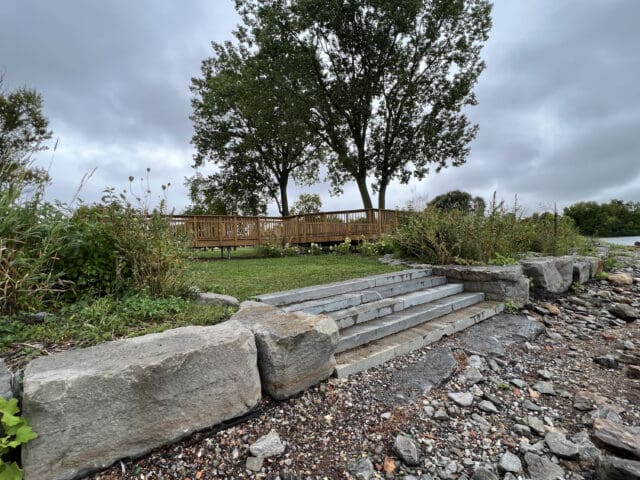 - Shoreline improvements along 670+/- linear feet of the St. Lawrence riverbank, including stone sill installation and riprap along with reconstruction of the trails.