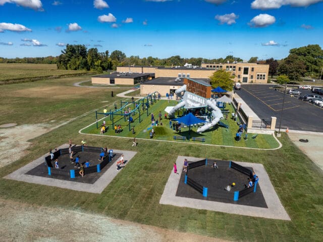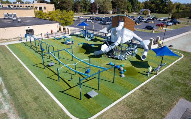 Featuring a more open and varied layout, the new playground offers play elements—such as slides, seesaws, and swings—that will appeal to students across all elementary grade levels.Volo Aire