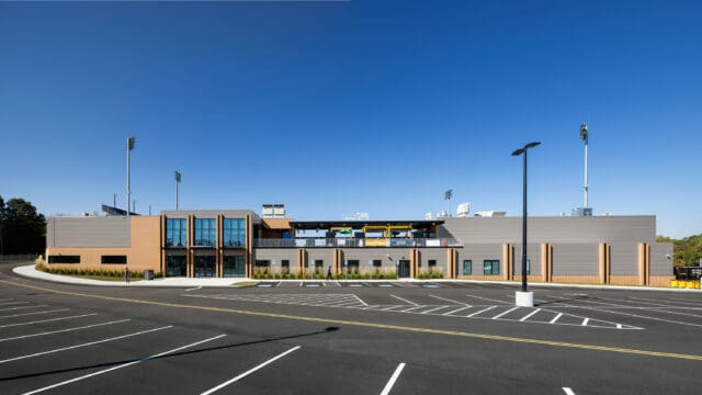Located along the Seekonk River, Tidewater Landing features a precast parking deck wrapped with two multi-family buildings, each containing 300 units. This mixed-use development also includes Centreville Bank Stadium—a 10,500-seat USL Championship League soccer stadium, an indoor events center for amateur sports, a hotel, a food hall, retail shops, parking garages, and a public plaza that serves as a connection between the various buildings and the river.