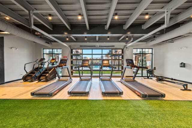 The interior design began by continuing the rustic industrial look from the exterior and prioritizing natural light in the space. The client’s appreciation for marketplace distinction allowed the design team to maximize glazing and experiment with varied window sizes and heights. The lobby and public spaces utilized large storefront and curtain wall glazing, while the residential units feature floor-to-ceiling glass windows. The use of texture, masonry, metal, and wood creates rich and visually robust interior spaces that exude resort-style living.